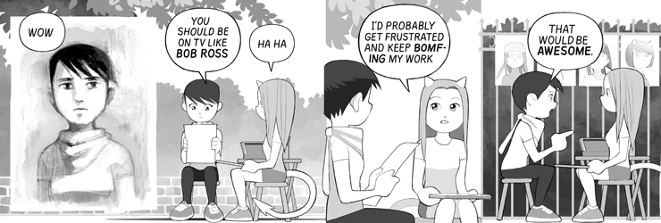 Setting aside the content, the art style on Sinfest changed so much. I read some of the early stuff, and every time I glance at it, it seems like the art style's significantly different. Not like, say, Peanuts or some other long-running comic strips.