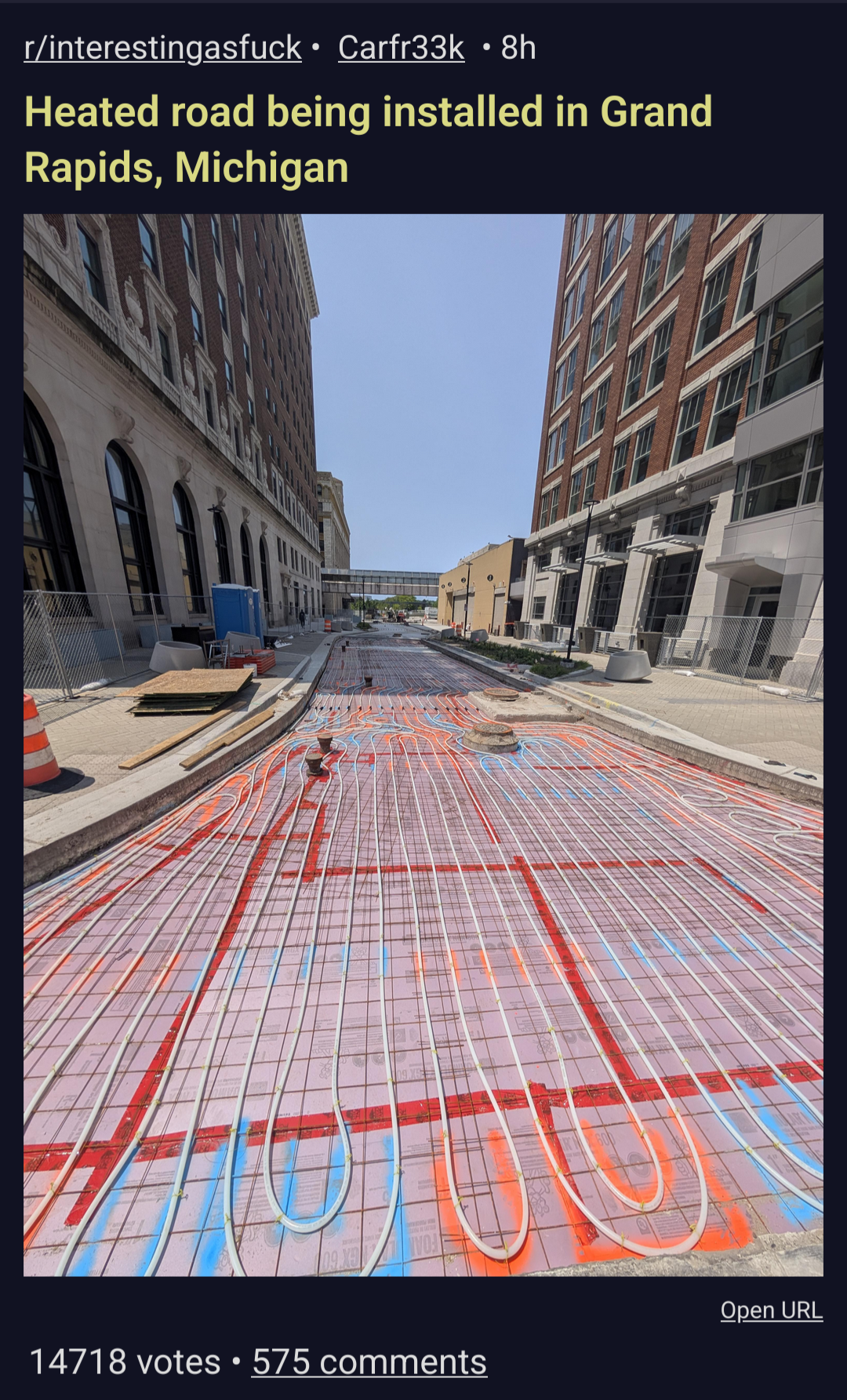 I am pretty sure there is plenty of excess heat in the sewers of most cities. Compared to having to redo the street and sewers from salt damage, operate a fleet of plows and all the other currently used measures, it could even be worth it if the heat comes from a boiler.