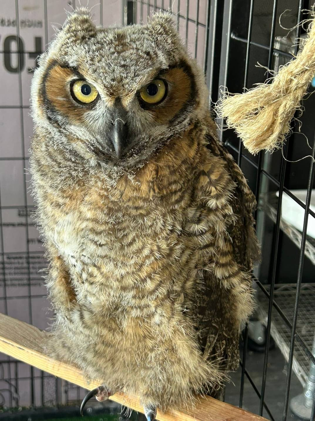 Minimize stress for the owl. If you can catch it, toss a towel or sweater over it and get it in a cardboard box or pet carrier. It should have room to be comfortable but not so much it can panic and injure itself. If you can’t catch it, keep people and animals away until help can come.