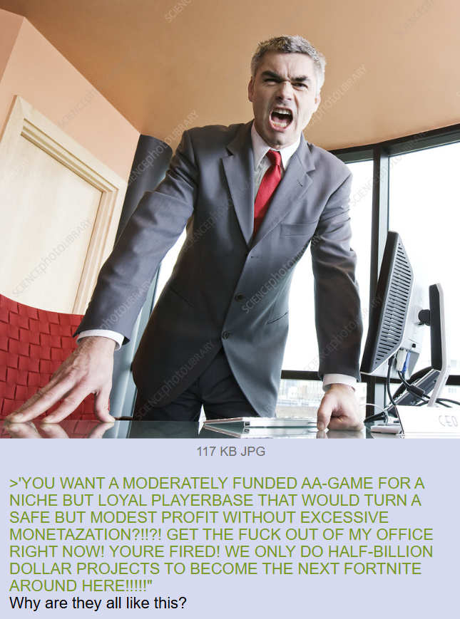 So, yeah. Game companies are the same kind of delulu that the manosphere thinks 90% of women are, chasing a wildly unrealistic outcome via wildly unlikely to work means.