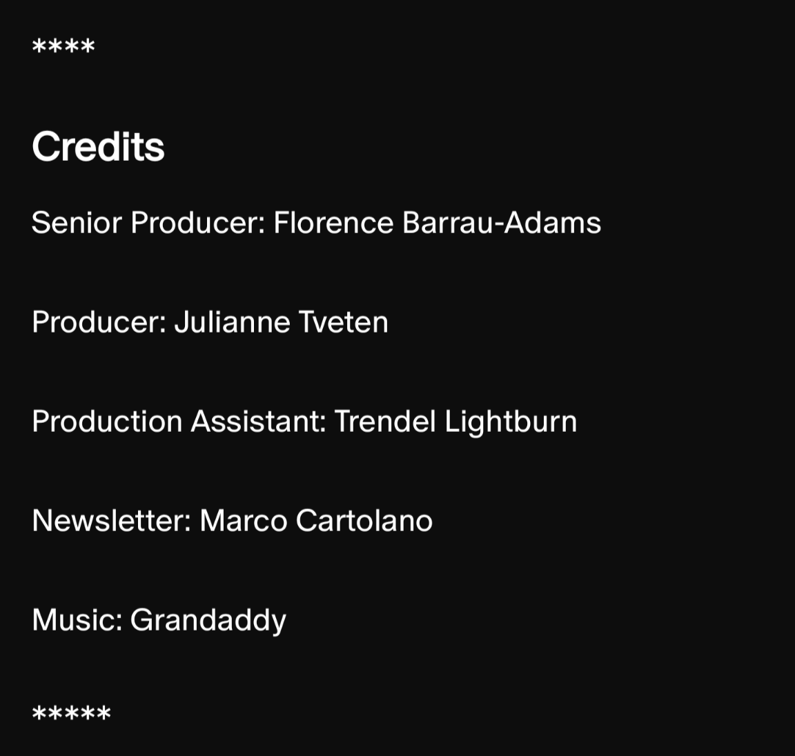 It's the most based leftist podcast out there and I've been listening for years, so the way one of the hosts reads out the credits at the end of each episode is burned into my brain now