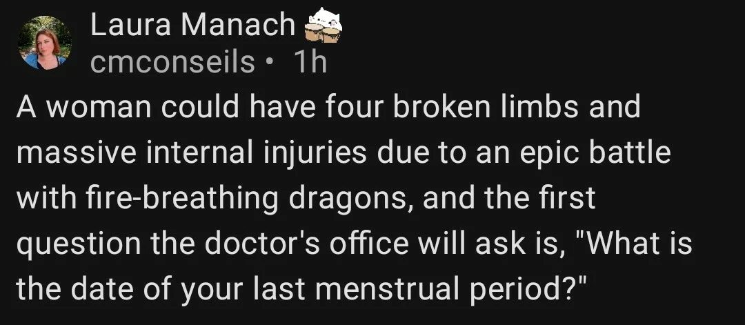 What happens is they ask you when your last period was. You tell them. They insist on a pregnancy test anyway. You say you don't care if you're pregnant, will immediately abort any fetus, and you understand the risks. They refuse to do anything at all until you take the pregnancy test anyway. And now you're in danger if you're in a red state and the test does come back up positive, because they'll be stalking your movements now.