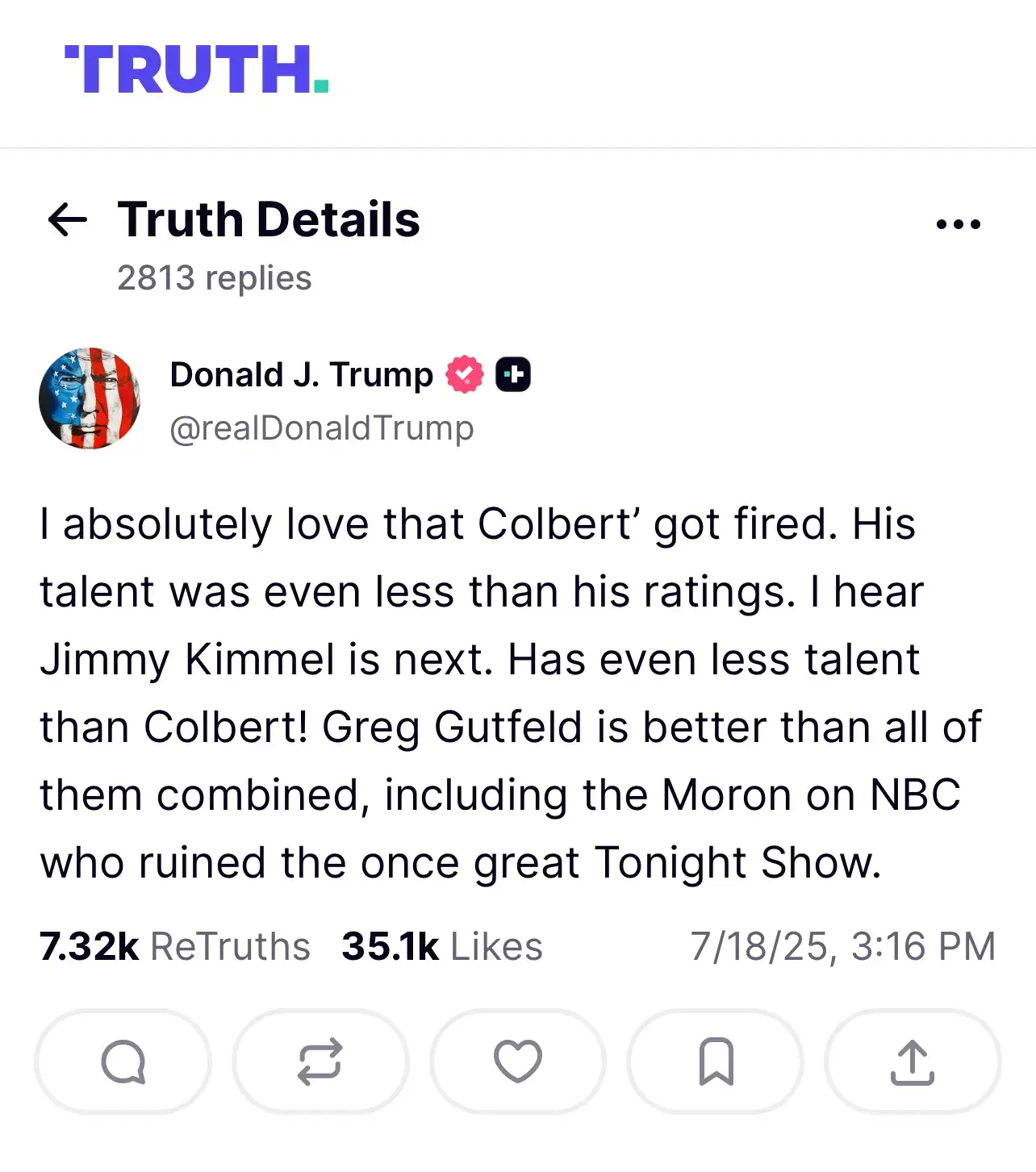 Trump had Colbert cancelled and said Kimmel was next on Truth Social back in July: https://truthsocial.com/@realDonaldTrump/posts/114874422468516376