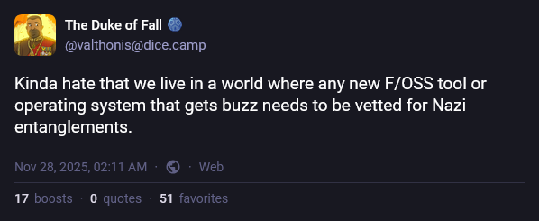 alt text: "Kinda hate that we live in a world where any new F/OSS tool or operating system that gets buzz needs to be vetted for Nazi entanglements."