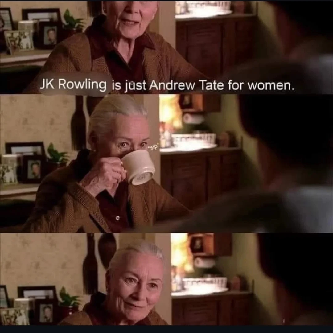 Both are serving as a pipeline for group-based enmity/bigotry for a specific target group. Tate pulls in sexually frustrated and insecure men and turns them into mysogynists. JKR pulls in middle aged insecure liberal-feminists and introduces them to transphobia.