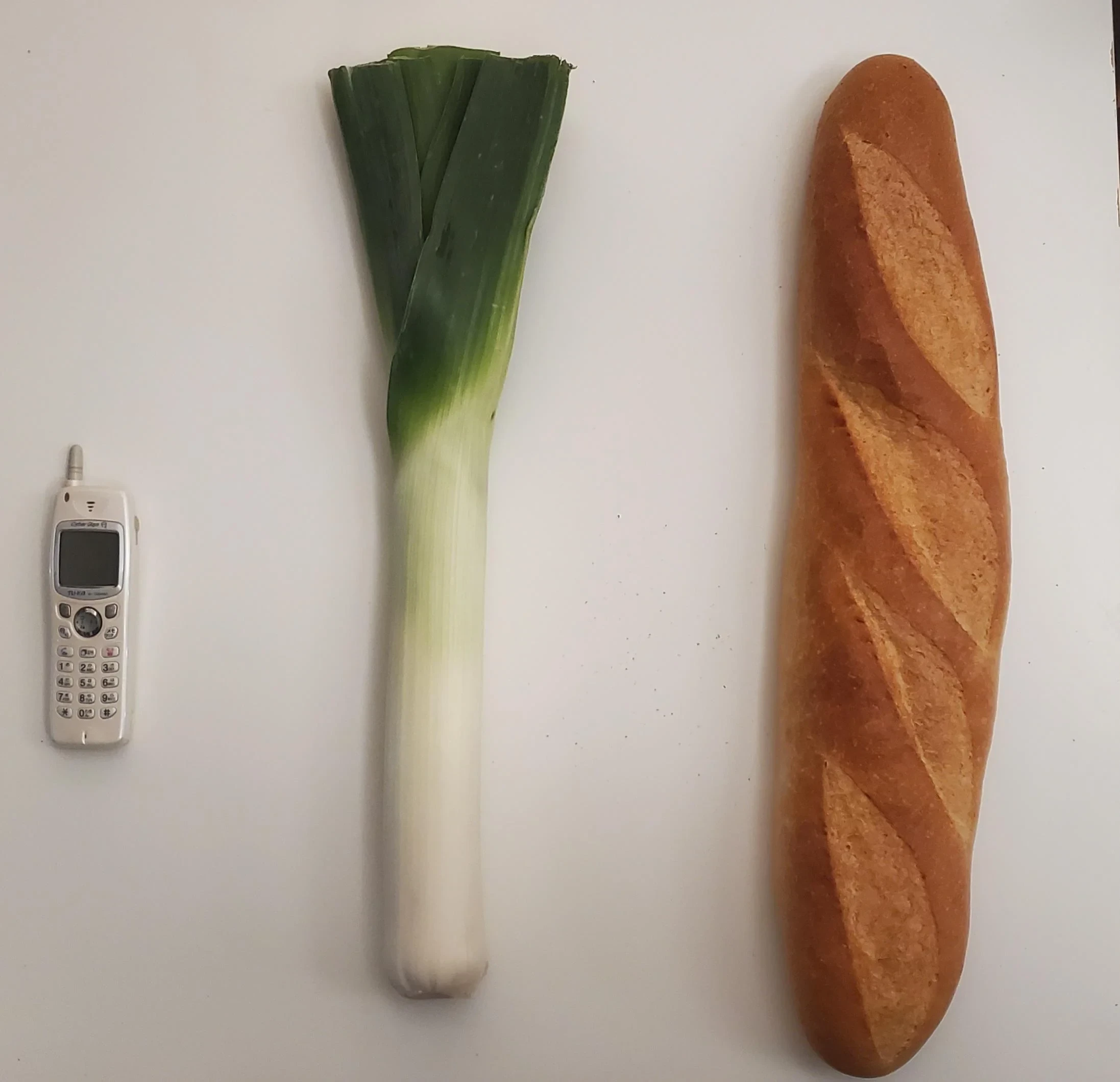 The leek is miku, the baguette is teto, and the phone is kagame rin (I think)