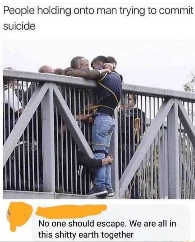 Every single person on that bridge there was helping this person. You have no idea what happened next, that lost soul may have just been taken in by their new found family - and you're advocating for that person to just die instead because they feel like it in that moment. Despite the overwhelming amount of suicide survivors reporting regret for their actions.