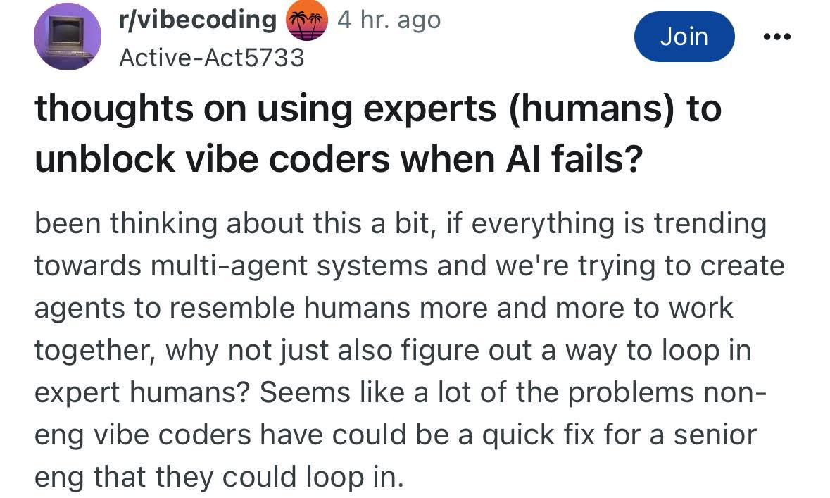 transcriptsubject: thoughts on using experts (humans) to unblock vibe coders when Al fails? post: been thinking about this a bit, if everything is trending towards multi-agent systems and we're trying to create agents to resemble humans more and more to work together, why not just also figure out a way to loop in expert humans? Seems like a lot of the problems non-eng vibe coders have could be a quick fix for a senior eng that they could loop in.