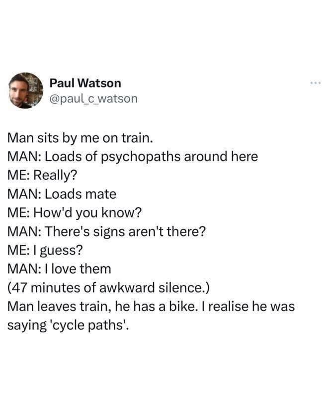 When we reach my stop, I get off the train with my bike. As I leave, I notice the guy suddenly looks relieved. As I walk away he looks at me like I was a random crazy psychopath on the train, then it finally hit me.