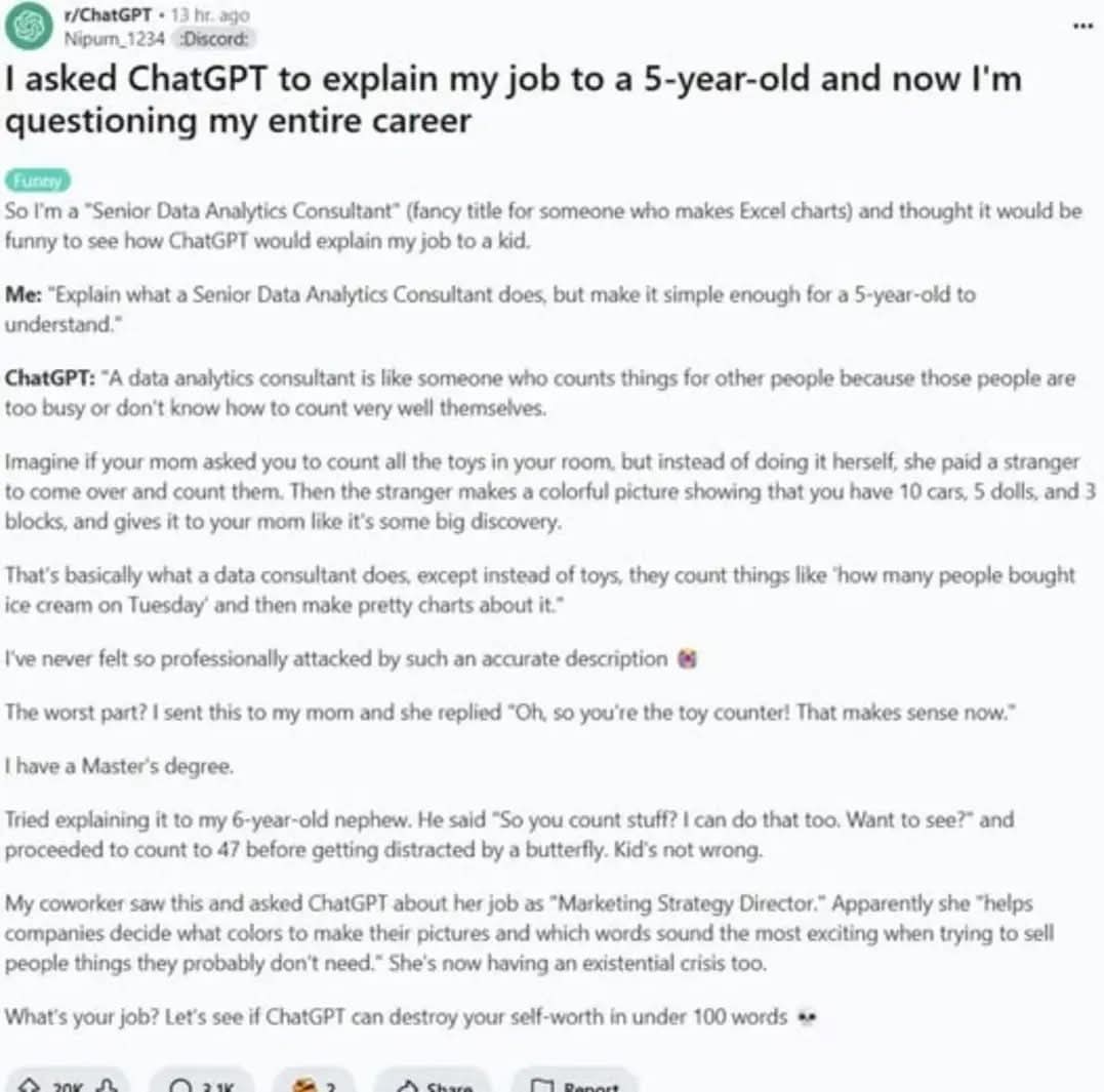I don't have a ChatGPT, but someone should ask it about AI Engineers (the ones that create/train AI models, not the ones that are stupid) and see whether it will talk down their job too haha