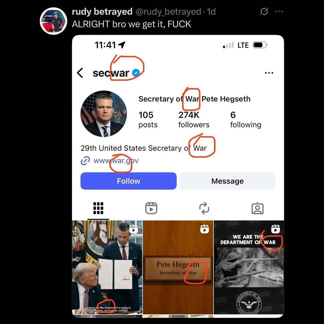 So the orange Cheeto, who is trying to get the Noble Peace Prize… just wrote an EO rename things to the Department of War