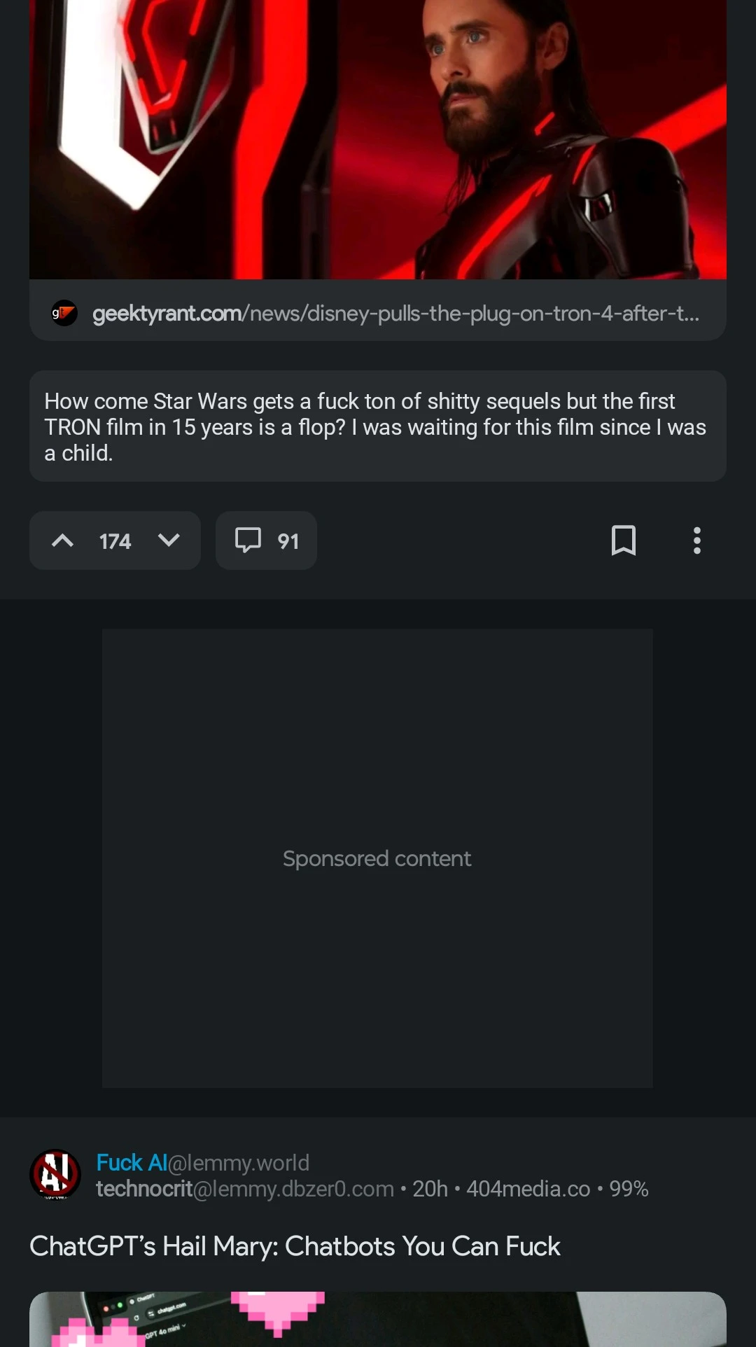 Side note, it's great that Lemmy has so many other choices. Any other platform you'd be stuck with the ads. But now that they've exceeded my threshold for tolerance, I can drop the whole app and still get all the features I want.