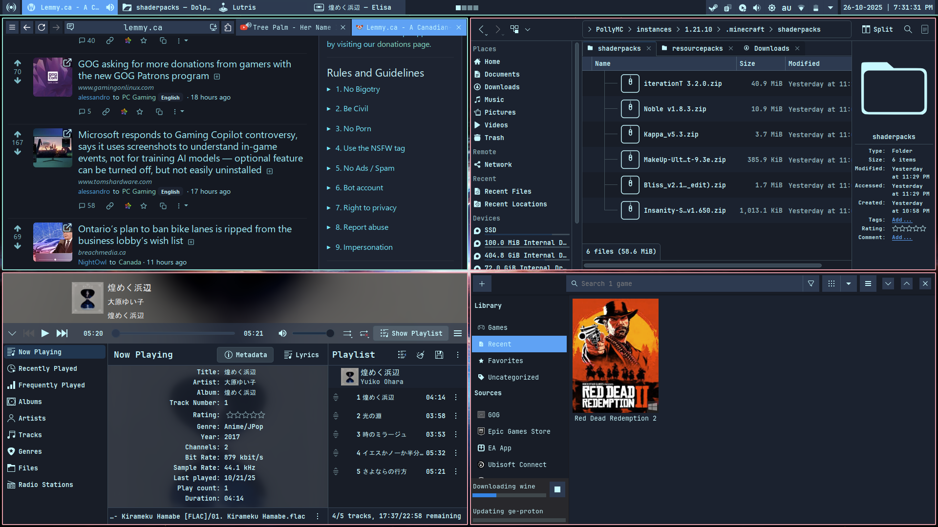 I switched from a Qtile tiling window manager to KDE with Krohnkite. It does the job of handling the windows. The auto tiling aspect is the only thing I miss in any regular window management. The reason why I switched to KDE back then was, a problem with Qtile and because KDE was good on the Wayland front. In fact, it was the only viable option in my opinion for a desktop environment. I was also using lot of KDE applications anyway, so it made sense.