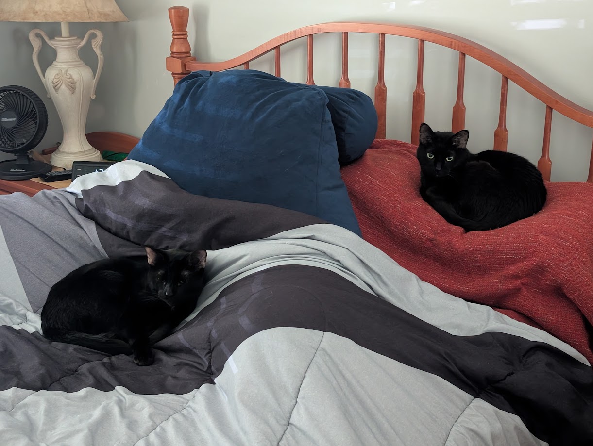 We have two cats, a void and a grump. The voids full name is Robert but he goes by Bob, my wife calls him "little kitty" because he was a tiny kitten when we got him, I call him "you fat fuck" because he got up to 19 lbs before we started putting him on a diet (14 lbs now)