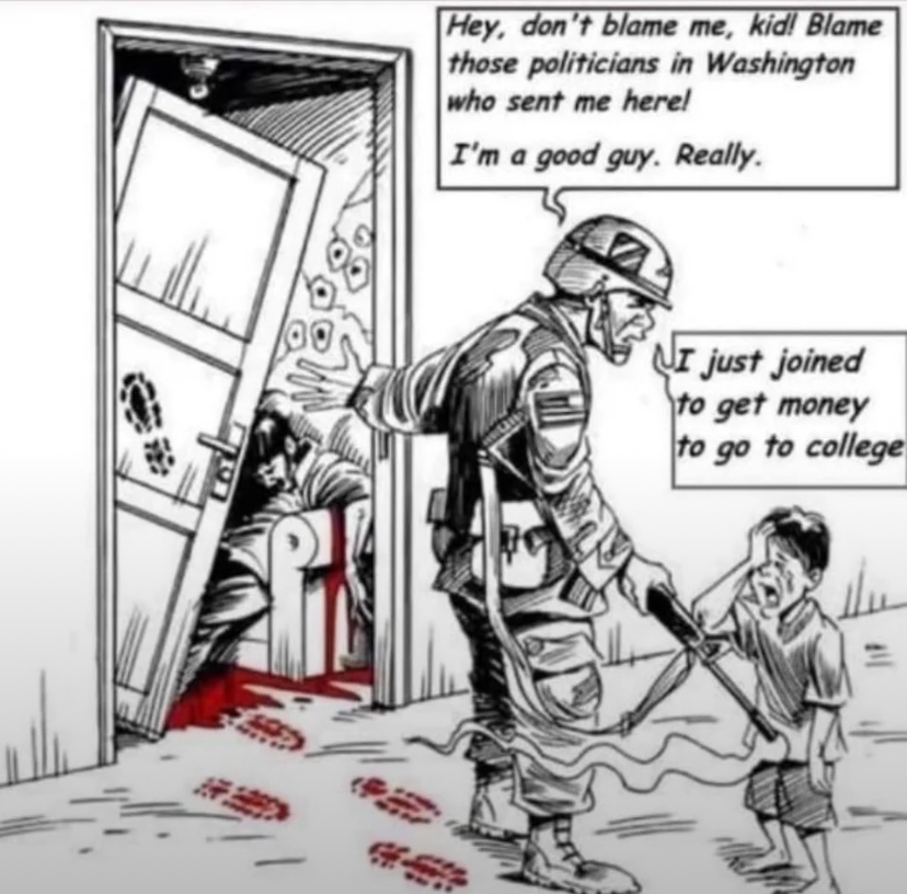 It's pure exploitation by the state of the ignorance and naivety of the average recruit as well as the capitalist system weaponizing its own failings. Most people in my boot camp platoon were under 20 and the vast majority of us came from disadvantaged backgrounds. I didn't know the term at the time but most people joined for the hope of class mobility along with getting the fuck out of wherever they came from. It also showed the strength of the US propaganda machine, especially in the immediate wake of 9/11, where the media was complicit in a massive coverup of US/ISAF atrocities and a whitewashing of the savage inhuman brutality that is implicit in war.