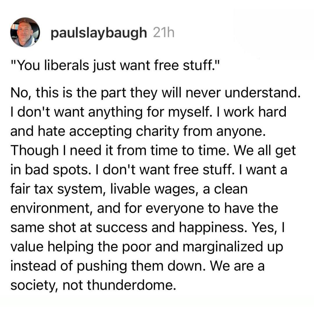 I just want everyone taken care of because I want to live in a society that takes care of all the people. I want good education because I want to be around well educated people. I want healthcare for everyone because I want to be around active healthy people who live to old age. I want limits and regulations for companies because I want clean air and safe products.