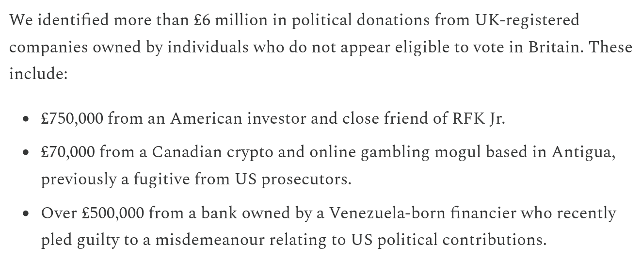 In many nations such as Canada, France or Australia, only citizens can give money to political parties. In Britain, a foreigner can wire money to political parties. It doesn't matter your citizenship. Just open a company in the UK and you can do that.